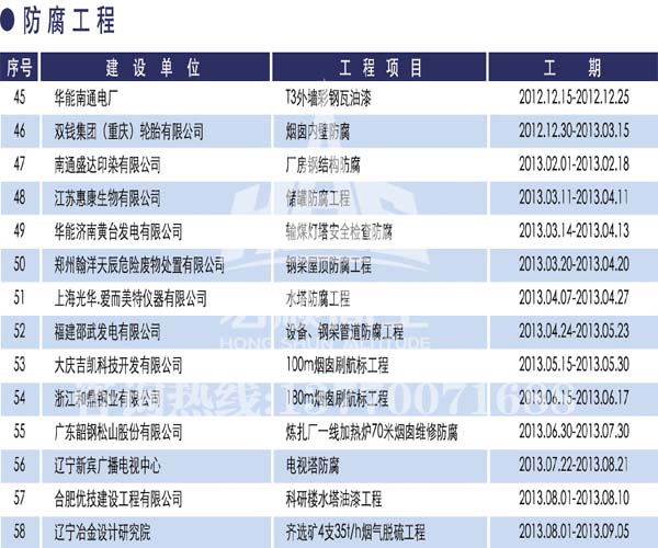 宏順建設工程有限公司是國家批準成立的專業高空作業企業:承攬過(國內.國外)煙囪新建、煙囪防腐、磚煙囪新建、煙囪改造、煙囪維修、煙囪脫硫防腐、煙囪拆除加高、煙囪滑膜等高空作業工程。具有“不搭腳手架 、 不需要停產”施工特點。